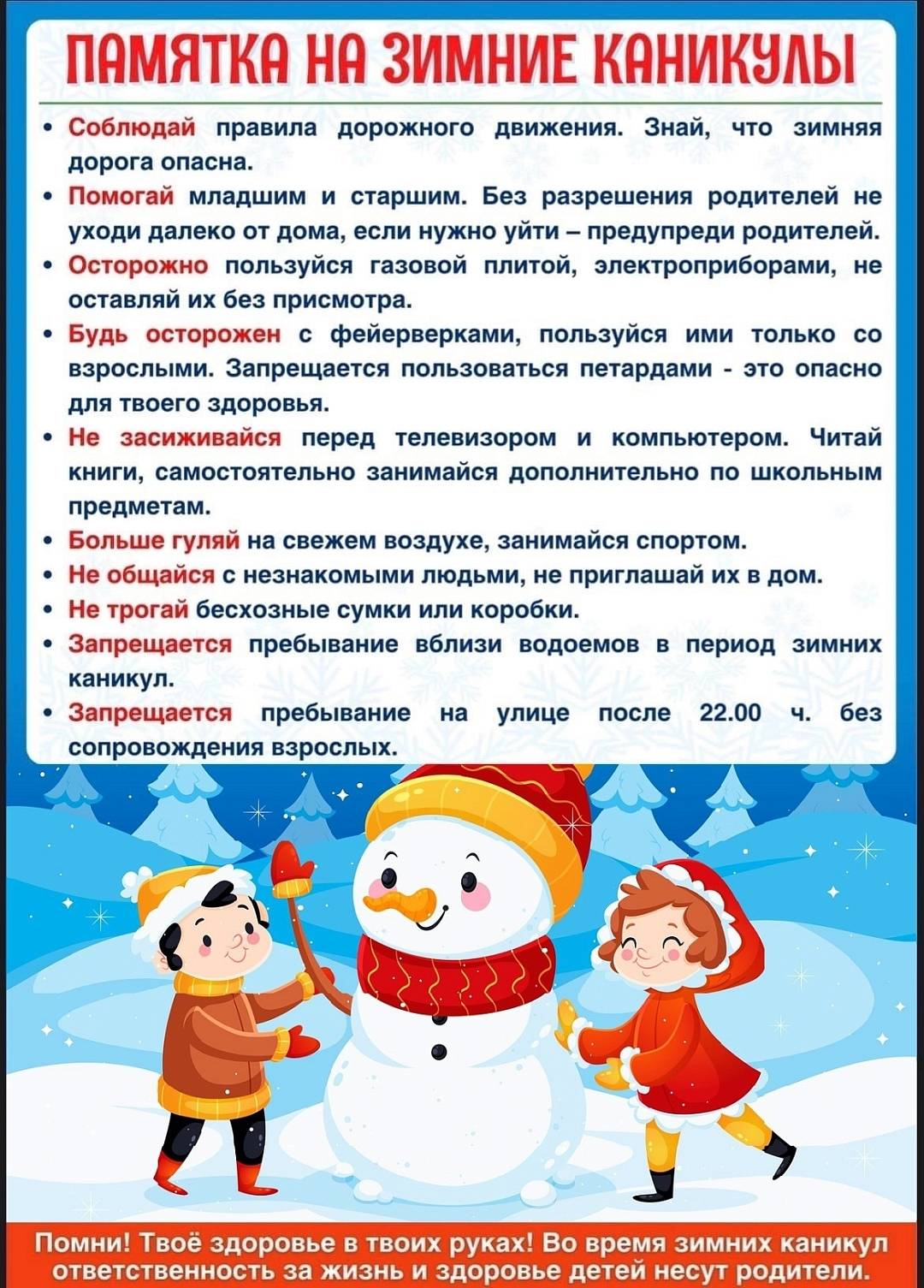 Уважаемые родители! Еще раз напоминаем вам что Новогодние праздники и зимние каникулы — замечательное время для детей и взрослых, пора отдыха, интересных дел и новых впечатлений. Однако важно не забывать о правилах безопасности, чтобы избежать неприятных
